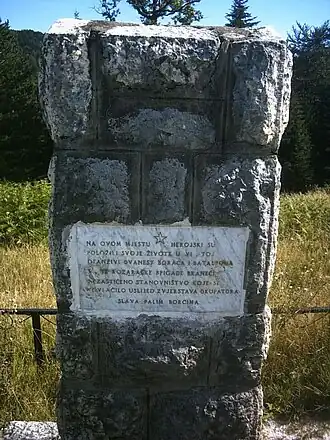 On this spot a dozen of fighters of the 1st battalion of the 5th Kozara Brigade gave their lives heroically defending unprotected civilians who were withdrawing pushed by the bestialities of the occupation forces. Glory to these fallen soldiers.