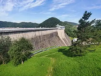 The dam is 664 m (2,178 ft) long, 8.8 m (29 ft) wide at the crest, and 81.8 m (268 ft) high. An estimated 820,000 cubic meters of cement was used for the construction of the dam, which weighs 2 million tonnes.[5] Its construction created the largest artificial lake in Poland – Lake Solina. It has four turbines which were initially capable of generating 136 MW of electricity. As a pumped-storage power station, two of the turbines can also reverse flow and send water from the Myczkowce Dam's reservoir back into the Lake Solina for use during peak periods, optimizing power generation. Starting in 1995 efforts have been made to modernize the power plant. The installation of new technologies between 2000 and 2003 and the replacement of the old turbines resulted in the dam currently generating 200 MW of electricity as opposed to 173 MW previously.[4]