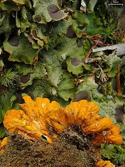 Solorina crocea is often infected by Rhagadostoma lichenicola, a lichenicolous (lichen-dwelling) fungus. Infection results in the appearance of crowded blackish ascomata on the upper surface of the host thallus and a highly branched, dark mycelium below the fruitbodies. Its presence does not seem to affect the fertility of the lichen, suggesting that the fungus requires the function and integrity of the host to remain intact. The abundance of certain strains in the associated bacterial community of the lichen has been shown to be altered by the fungal infection. Bacteria normally associated with the lichen include members of the phyla Acidobacteriota, Planctomycetota, and Proteobacteria.[15] Another lichenicolous fungus, Talpapellis solorinae, was described as a new species in 2015 from collections made in North Caucasus; it does not cause distinct damage to the infected host thallus.[33] Other fungi that have been recorded infecting Solorina crocea include Arthonia peltigerina, Cercidospora punctillata, Corticifraga peltigerae,[34] Cercidospora lichenicola, Pyrenidium actinellum,[35] Stigmidium croceae, Protothelenella croceae,[36] Thelocarpon epibolum,[37] and Pronectria robergei.[38] Infection by Stigmidium solorinarium results in the appearance of minute perithecia, while infection by Scutula tuberculosa will result in greyish to black lecideine apothecia.[16]