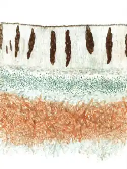 There are six to eight ascospores in each ascus of Solorina crocea. They are brown with an ellipsoid shape, and contain a single transverse septum that divides the spore into two compartments.[14] Based on a sampling of European specimens, the ascospores were measured to be an average of 11.0 μm wide (ranging from 8.4 to 21.2 μm) by 39.0 μm long (ranging from 26.6 to 51.1 μm).[21] The fine details of ascospore structure have been studied using scanning electron microscopy, revealing that there is a consistent, distinctive ornamentation in the spores of each of the most common arctic-alpine Solorina species. In S. crocea, the spores are covered with irregularly shaped papillae (small pimple-like structures), but do not form ridges or reticulations. The tips of the spores are rounded, and there is a slight constriction between the two cells.[22] Solorina octospora has similar spore size and ornamentation as S. crocea, but it does not have solorinic acid nor the subsequent orange-coloured medulla.[21]