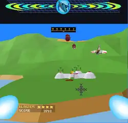 Solvalou is a third-person shooter video game set in the Xevious universe. Its plot takes place in the year 2015, following a war between humans and androids named the GAMP. The humans launch the titular starship to destroy the GAMP and its mothership before they wipe out the rest of humanity.[1] The Solvalou is restricted to a pre-determined flight path, though players can move it around to avoid projectiles and obstacles that approach it. The game is divided into six levels that gradually increase in difficulty. In each of these, the Solvalou must make it to the end while destroying moving formations of enemies.[1][2] The Solvalou has two weapons at its disposal: an "air zapper" that is used for destroying aerial enemies, and a "blaster bomb" that is used for destroying ground-stationed enemies. A maximum of five bombs can be launched at once, and the player needs to wait for them to regenerate before firing again. The top of the screen displays the player's health bar, or "shield", which depletes by one when inflicted by an enemy projectile.[1] When the meter is drained, the game is over. At the end of each stage, players are scored based on how many enemies they defeated. Some levels end in a boss fight, usually with a mothership named the Andor Genesis.[1][2]