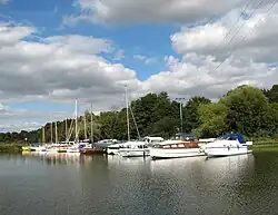 The Lowestoft to Norwich railway line runs through the parish close to the Waveney, crossing the river at Somerleyton Swing Bridge. Somerleyton railway station on the edge of the village has operated since 1847.[1] The lines passes close to Cockerell's boatyard, Somerleyton Marina, and the site of the former Somerleyton brickworks which produced bricks for the buildings such as Liverpool Street railway station. The brickworks closed in 1939 and the chimneys were subsequently demolished.[22][24][26]