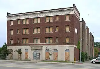 The Somerset Apartments were five interconnected rectangular buildings, each four stories, built in a row running rearward from Jefferson.[2] It had 80 units and was over 45,000 square feet (4,200 m2).[3] The front façade was symmetrical, faced with limestone on the first story and red brick above, with arched windows on the first floor.[2] The roofline had a dentiled cornice with a white frieze below.[2]