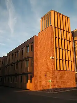 Vaughan is the larger of the two, with eleven rows to its concrete frame compared to eight.[82] It is Grade II-listed and contains some 60 undergraduate rooms, smaller than those of Margery Fry and used exclusively for first-year students, along with the junior deans.[83] Vaughan was refurbished in 2013, with new bathroom facilities, including, for the first time, sinks. Beneath the two buildings, a tunnel provides access to Somerville from Little Clarendon Street.[76]
