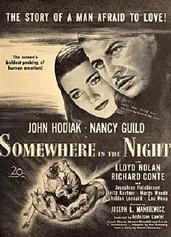 Somewhere in the Night is a 1946 American film noir psychological thriller film directed by Joseph L. Mankiewicz, written by Mankiewicz with Howard Dimsdale and Lee Strasberg based on a short story by Marvin Borowsky. It stars John Hodiak, Nancy Guild, Lloyd Nolan and Richard Conte.
