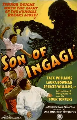 Son of Ingagi is a 1940 American film directed by Richard C. Kahn. It was the first science fiction horror film to feature an all-black cast.[1][2] It was written by Spencer Williams based on his own short story, House of Horror. Although the film's title appears to suggest that it is a sequel to the 1930 movie Ingagi, it is not. (The latter is an exploitation film in the guise of an ethnographic film in which purported African women are given over to gorillas as sex slaves.)
