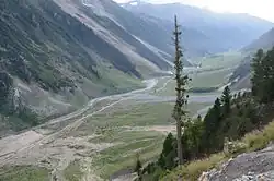 Sonamarg provides glaciers like Kolahoi Peak & trekking routes leading to Vishansar Lake, Krishansar Lake, Gangabal Lake , and Gadsar Lake in the Himalayas, which are stocked with snowtrout and brown trout.[12] The Sind River meanders here and abounds with trout and mahseer. Ponies can be hired for a trip up to Thajiwas glacier, in the summer. The Yatra to the nearby Amarnath Temple begins in Sonamarg.