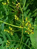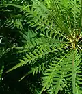 Tall shrub up to 2 m. Leaves pinnatisect with 10-15 pairs of equally spaced lobes, the lobes 6–40 mm wide. Inflorescence very large and dense, compound-corymbose. Individual heads with 30-50 yellow ray florets but no disc florets.