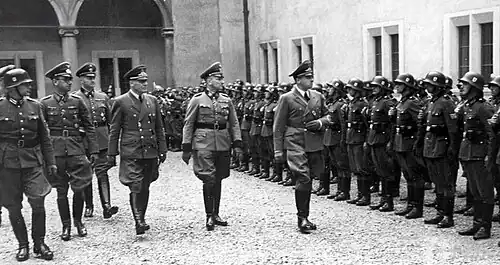 ![]() Leaders of General Government during inspection of Sonderdienst battalions: from right, Generalgouverneur Hans Frank, Higher SS and Police Leader GG Herbert Becker and secretary of state Ernst Boepple | |