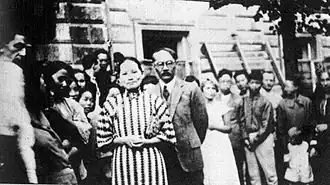 After graduating, Ching-ling's elder sister, Ai-ling, returned to Shanghai in 1908 and became the secretary to Sun Yat-sen.[21] Sun became fascinated with Ai-ling, constantly gazing at her, although Ai-ling did not reciprocate his feelings in the same way.[27] Ching-ling graduated from Wesleyan in 1913, and returned to China via Yokohama, Japan, where she met Sun.[24] Ai-ling resigned in 1914 to marry H. H. Kung, passing the position on to Ching-ling,[21] who admired Sun as the hero who founded the Chinese Republic.[28] In the summer of 1915, Ching-ling returned to Shanghai, asking her parents for their permission to marry Sun, which shocked the family.[29] Ching-ling was confined at home in Shanghai, during which Sun divorced with his wife Lu Mu-zhen.[30]
