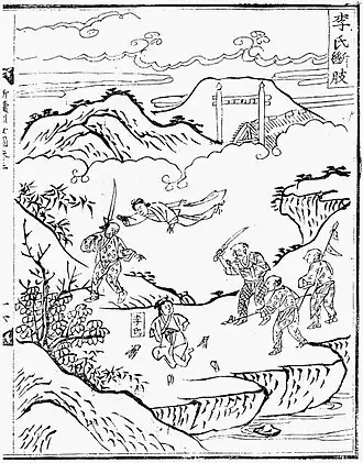 Much of the academic research on the Song of Dorang-seonbi and Cheongjeong-gaksi has focused on its relationship to patriarchal social structures.[58] The long-ruling Joseon dynasty (1392–1910) of Korea sought to mold Korean family structures along Neo-Confucian patriarchal values, and a key part of this effort was the promotion of the social ideal of the "virtuous woman" (열녀/烈女, yeolnyeo): a wife totally devoted to her husband. Moralistic tracts published by the Joseon government include hundreds of stories of such "virtuous women," including dozens of young women who committed suicide when their husbands died and one tale of a young widow who cut off her hair, ears, and nose to protest her family's suggestions that she remarry.[59]