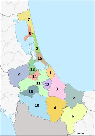 As of 26 November 2019 there are:[17] one Songkhla Provincial Administration Organisation (ongkan borihan suan changwat) and 48 municipal (thesaban) areas in the province. Songkhla and Hat Yai have city (thesaban nakhon) status.[18] Further 11 have town (thesaban mueang) status and there are 35 subdistrict municipalities (thesaban tambon). The non-municipal areas are administered by 92 Subdistrict Administrative Organisations - SAO (ongkan borihan suan tambon).