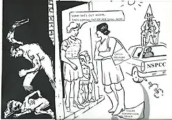 In the early 1970s Lawson became influenced by the campaign Justice for Maria Colwell against cruelty to children. The illustration 'Coming out of her Shell' shows a sunny outdoor scene where a social worker is fobbed off, while behind closed doors a brutal beating continues. The image does not depict any one child, rather it shows the universal tragedy of failures in child protection: sadly still very relevant today.