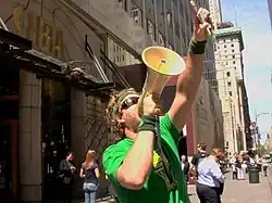 ![]() Sonicsgate director Jason Reid draws attention to the Sonicsgate story speaking through a bullhorn outside the flagship NBA store in New York City. | |