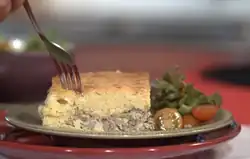 Sopa paraguaya (Spanish for 'Paraguayan soup') is a traditional food in Paraguayan cuisine similar to corn bread, spongy and soft. Corn flour, cheese, onion and milk or whey are common ingredients. It is a cake rich in caloric and protein content.