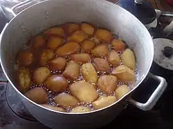 In Chile, sopaipillas (or sopaipas) are known to have been eaten at least since 1726.[9] Although traditional Chilean sopaipillas made in central Chile include cooked ground pumpkin in their dough, this is typically not the case in the south.[2] Depending if they are served as a pastry or bread Chilean sopaipillas are traditionally served with either pebre (a sauce of chili pepper, onion, garlic and coriander) or boiled in chancaca sauce (a homemade hot syrup cooked with panela, orange peel and cinnamon, and then they are called sopaipillas pasadas). They are also served with mustard, ketchup, hot butter, avocado or cheese.[2][3][9] In Chile sopaipillas are traditionally homemade and eaten during days of heavy rain,[2] as well as enjoying widespread popularity as street food, especially during winter. Chilean sopaipillas are round and flat, sporting holes pricked through the centre of the dough, usually by a fork.