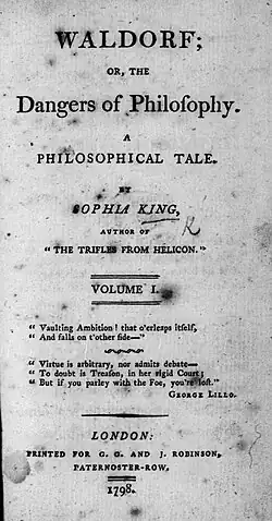 - Waldorf; or, the Dangers of Philosophy. A philosophical tale. By Sophia King, author of "the Trifles from Helicon." London: G. G. and J. Robinson, 1798.