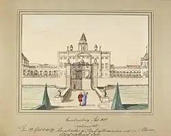 The queens acquisitions occupied an area roughly defined by present-day Bredgade, Frederiksgade, Amaliegade and Sankt Annæ Plads.[1] Work on the garden began in 1664 and from 1666 to 1667 the Frenchman Michel le Roy was responsible for its design, particularly that of the fountains and the water system.[1] The pleasure palace was built from 1669 to 1673 after Sophie Amalie had succeeded in providing the necessary means in spite of the hard times following the war. It is unclear who was the architect of the building but it is generally attributed to Albertus Mathiesen.[2] Another possibility is that le Roy was also involved in the design of the palace and not only the gardens. In early documents he is referred to merely as "Ingenieur", while he is later titulated "Baumeister der Koniginn".[1]