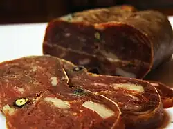 Soppressata is a salume. Although there are many variations, two principal types are made: a cured dry sausage typical of Basilicata, Apulia,[1] and Calabria, and a very different uncured salami made in Tuscany and Liguria. It is still part of southern Italian cultural heritage that local people (especially in the smaller rural towns) slaughter the pig themselves and use it all, with nothing going to waste, using some parts to make cured meats, including soppressata. It is sometimes prepared using prosciutto.[2]