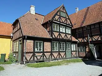 Another building to the rear of the one facing the street, also 15 bays long but only one storey high, also dates back to the 17th century in its original form but underwent alterations in the 18th century and again later. The cobbling between the two buildings and along the street is the last remains of the old pavements of Sorø's main street.