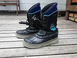 Sorel was originally a line of winter sport/work boots that were introduced in 1962 by the Kaufman Rubber Company of Kitchener, Ontario.[1][2] They became its most successful product line. Kaufman Rubber Co. became Kaufman Footwear in 1964. The Kaufman brand is located on the bottom of the RBLT's (Rubber bottom leather top) that were the general purpose fleece lined flight boots used in the RCAF in the post WW2 era. Kaufman Footwear declared bankruptcy in 2000.[3] The Sorel trademark was bought by Columbia Sportswear.[4] Following Columbia's purchase, the Sorel brand was expanded to other products,[5] such as nylon outerwear and other work-related garments.[6]