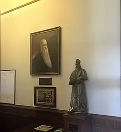 A bronze statue of Fr. Sorin resides in the front hallway. It is a replica of the large statue that was dedicated on the Main Quad on 3 May 1906. Sorin residents rub his right foot for good luck when they pass by it.[4] The statue has been the target of a number of Sorin resident pranks and would often disappear for short periods of time. In January 1953, the statue went missing just before the Christmas break and the Student Senate resolved to find the statue. "Although traditionally a wanderer on the ND campus, Father Sorin's present disappearance has lasted so long that concern is arising that it may be a permanent one" [Scholastic issue 01/16/1953, page 13]. Shortly thereafter, postcards and letters began coming in from around the world supposedly sent by the statue itself. The statue claimed to have attended some of the year's most important events such as Dwight D. Eisenhower's Inauguration, Queen Elizabeth II's Coronation, and Joseph Stalin's funeral. The mystery persisted, until just before Commencement 1953, the statue arrived at Main Circle in a cab surrounded by a cheering crowd. Alumnus Camillus Witzieben had found the statue in the snow, and instead of returning the statue to Sorin Hall, Witzieben and his friend August Manier buried the statue in a sand trap on the Golf Course and later moved it to a house in Chicago until its triumphant return. In the meantime, their military friends sent them postcards from a variety of destinations around the world. In 1955, the statue was brought to the Kentucky Derby and sent a telegram to Notre Dame saying that he 'lost it all on Nashua' and was 'returning home' that night at 8 o'clock. The statue returned once again by car to Main Circle.[24]