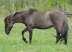 Sorraia are generally dun or a dun variation called grullo. Dun coloring includes primitive markings such as a black dorsal stripe, black tipped ears, horizontal striping on the legs and a dark muzzle area.[5] The dark muzzle area is in contrast to some other dun-colored horse breeds, who have light-colored muzzle areas and underbellies, possibly due to the presence of pangare genetics.[6] Sorraia horses have bi-colored manes and tails with lighter colored hairs that fringe the outside of the longer growing black hair.[4] This is a characteristic shared with other predominantly dun-colored breeds, such as the Fjord horse.[7] Purebred Sorraia occasionally have white markings, although they are rare and undesired by the breed's studbook.[4]
