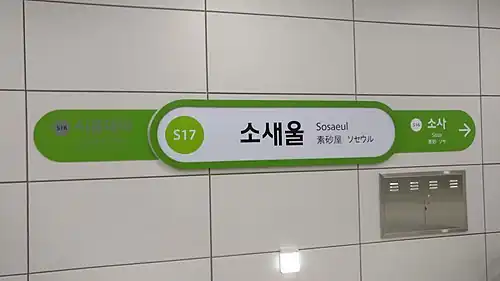 Sosaeul station is a station on the Seohae Line in South Korea. It opened on June 16, 2018.[1][2][3][4]