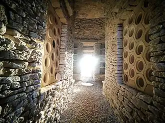 The barrow contains niches for the placement of cremation urns.[4] It is also intended for wider celebration of life and community activity. The structure is a sequence of stone chambers under an earthen mound, and was begun in 2017, with a principal stone being laid in the spring of 2018,[5][6] and an early stone being added by writer and historian Tom Holland.[7]