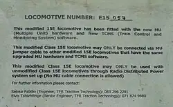 During 2015, the Class 15E fleet began to be equipped with new multiple unit (MU) hardware and train control and monitoring system (TCMS) software. Modified locomotives carried temporary plaques on their front doors to indicate that the modification had been carried out and to warn train crews that the locomotive may not be connected to an unmodified locomotive by multiple unit jumper cable. Modified locomotives could only be used with unmodified locomotives through the radio distributed power system.