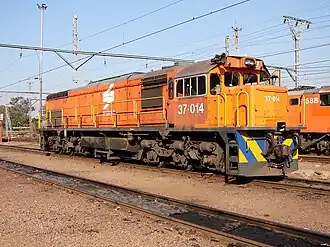The Class 37-000 type GT26M2C diesel-electric locomotive was designed for the South African Railways (SAR) by General Motors Electro-Motive Division (GM-EMD) and built by General Motors South Africa (GMSA) in Port Elizabeth. Equipped with later model GM-EMD D31 traction motors instead of the earlier GM-EMD D29B, it is a more powerful version of the GM-EMD type GT26MC Classes 34-200, 34-600 and 34-800.[2]