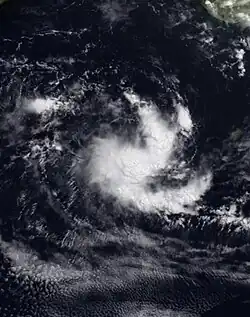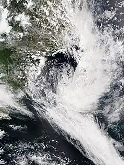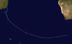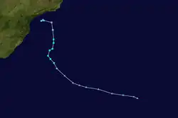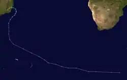On 22 March 2019, a low-pressure area formed off the coast of Bahia after the passage of a frontal system.[57] On the next day, the cyclone developed a deep warm-core, thus being designated as a tropical depression.[57][58][59] On 24 March, the system intensified into a tropical storm, receiving the name Iba from the Brazilian Navy Hydrographic Center.[57] After moving southwestward for a couple of days, on 26 March, Iba reached its peak intensity.[57] Afterward, a cold front would approach the storm, which helped intensify the wind shear impacting Iba, leading to its weakening and extratropical transition.[57] On early 28 March, Iba would degenerate into a remnant low, becoming fully extratropical a day later.[57][60]