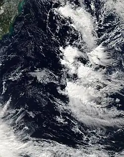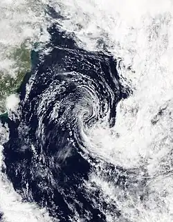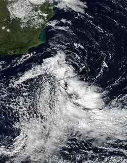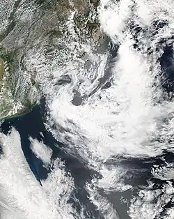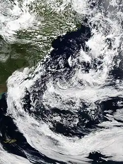 On 21 January 2020, the Brazilian Navy Hydrographic Center began monitoring an area of persisting thunderstorms near São Paulo for potential subtropical cyclone development. Generally tracking southeastward, the system began to organize within the afternoon of 22 January, aided by the establishment of a South Atlantic Convergence Zone, and was designated a subtropical depression early on 23 January.[64] Several hours later, due to a lack of wind shear, the system intensified into a subtropical storm and was given the name Kurumí.[65] After this bout of intensification, Kurumí moved southward and began to succumb to much more unfavorable conditions. It weakened back to a subtropical depression on late 24 January, due to an intensification of wind shear over its circulation due to the formation of an extratropical cyclone to its southeast.[64][66] The last advisory was issued on Kurumí later that same day, as it degenerated into a trough while also beginning to merge with the nearby frontal system.[64]