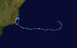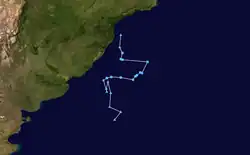 On 8 December 2017 a South Atlantic Convergence Zone aligned with a through axis led to the formation of several instability areas.[51] On 9 December a subtropical storm formed from this setup, on border between Espírito Santo and Bahia, moving southeastwards away from land.[51][52][53][54] On late 10 December, a Cold front pushed Guará southwards towards cooler waters, where it started transitioning into an extratropical cyclone.[51] On early 11 December Guará attained its peak intensity,[55] shortly thereafter degenerating into a low-pressure area associated with a through axis.[51][56]