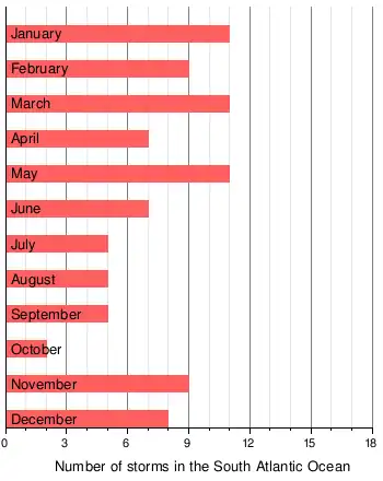 It was initially thought that tropical cyclones did not develop within the South Atlantic.[1] Very strong vertical wind shear in the troposphere is considered a deterrent.[2] The Intertropical Convergence Zone drops one to two degrees south of the equator,[3] not far enough from the equator for the Coriolis force to significantly aid development. Water temperatures in the tropics of the southern Atlantic are cooler than those in the tropical north Atlantic.[4]