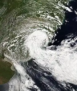 Hurricane Catarina was an extraordinarily rare hurricane-strength tropical cyclone, forming in the southern Atlantic Ocean in March 2004.[13] Just after becoming a hurricane, it hit the southern coast of Brazil in the state of Santa Catarina on the evening of 28 March, with winds up to 100 miles per hour (160 km/h) making it a Category 2-equivalent cyclone on the Saffir–Simpson hurricane scale.[14] Catarina killed 3 to 11 people and caused millions of dollars in damage in Brazil.[15]