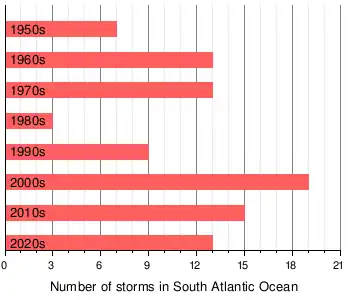 At the Sixth WMO International Workshop on Tropical Cyclones (IWTC-VI) in 2006, it was questioned if any subtropical or tropical cyclones had developed within the South Atlantic before Catarina.[7] It was noted that suspect systems had developed in January 1970, March 1994, January 2004, March 2004, May 2004, February 2006, and March 2006.[7] It was also suggested that an effort should be made to locate any possible systems using satellite imagery and synoptic data; however, it was noted that this effort may be hindered by the lack of any geostationary imagery over the basin before 1966.[7] A study was subsequently performed and published during 2012, which concluded that there had been 63 subtropical cyclones in the Southern Atlantic between 1957 and 2007.[8] During January 2009, a subtropical storm developed in the basin, and in March 2010, a tropical storm developed, which was named Anita by the Brazilian public and private weather services.[9][10] In 2011, the Brazilian Navy Hydrographic Center started to assign names to tropical and subtropical cyclones that develop within its area of responsibility, to the west of 20°W, when they have sustained wind speeds of at least 65 km/h (40 mph).[11]