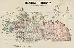 Road boards were the first local government in South Auckland in the 1860s, which were established across the Auckland Province due to a lack of central government funding for road improvements.[113] In South Auckland, over 20 road boards were established to administer upkeep for major arterial connections, some of which included the Drury Road Board, Mangere Road Board, Awhitu Road Board and the Hunua Road Board.[160] In 1876, the Manukau County was established as the local government for South Auckland.[161] In 1881, the Town District Act allowed communities of more than 50 households to amalgamate into a town district. Large town districts were able to form boroughs, which had their own councils and a greater lending power.[162] The county was split into two bodies in 1912: the Manukau County Council and a new body, the Franklin County Council.[163] Between 1912 and 1955, seven areas of South Auckland split from the Manukau, Franklin or Eden Counties to form independent boroughs: Pukekohe and Ōtāhuhu in 1912, Manurewa in 1937, Papakura in 1938, Papatoetoe in 1946 and Waiuku and Tuakau in 1955.[113]