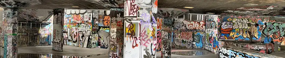 The undercroft of the Queen Elizabeth Hall has been used by skateboarders since the early 1970s. Originally an architectural dead-spot, it became a landmark of British skateboarding culture, but later was under threat, though supported by the Long Live Southbank campaign. Part of the Southbank Centre was turned into shops looking out over the river.