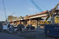 On-site construction began in June 2017 with the preparation of work areas and installation of fencing.[79][80] The historic Frederick W. Winters House and blueberry farms in Mercer Slough Nature Park closed to visitors in October to prepare for light rail construction along Bellevue Way.[81] Utility relocation was completed in early 2018 and was followed by the start of column construction, which required long-term lane closures on Bellevue Way; the street was arranged to have two lanes open in the peak direction and one lane in each direction during mid-day.[82] The installation of precast concrete girders to support the trackway and platform at the station began in mid-July;[83] the parking garage was constructed in two phases, beginning with the north half in 2018.[84] In 2019, the parking garage was topped out and work on the station's elevators and escalators began;[80] Sound Transit also restored 6 acres (2.4 ha) of wetlands in Mercer Slough Nature Park as part of mitigation for the project.[4] By the end of the year, the South Bellevue contract had reached 77 percent completion and tracks were installed on elevated sections.[85] The traction power substation to power the overhead lines for the light rail vehicles was delivered to the South Bellevue station site in April 2021.[86]