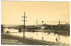 A wooden bridge over the Raritan River was erected as early as 1761 and named Queen's Bridge in 1767. Later, it became a covered bridge. During the Revolutionary War, the bridge was used repeatedly by both sides including during the Battle of Bound Brook in 1777. In 1875, the wooden bridge was replaced by a steel pipe truss bridge.[28] More than 100 years later, that bridge was itself replaced by a steel girder bridge in 1984, still using the old pillars.[29] The bridge was renovated and paved in 2007.