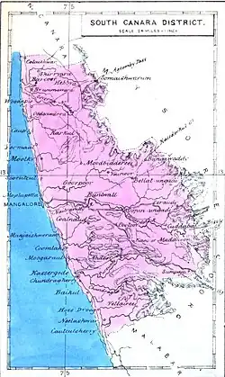 South Canara (South Kannada) was a district of the Madras Presidency of British India, located at 13°00′N 75°24′E / 13.00°N 75.40°E.[2] It comprised the towns of Kassergode and Udipi and adjacent villages, with the administration at Mangalore city. South Canara was one of the most heterogeneous areas of Madras Presidency, with Tulu, Malayalam, Kannada, Konkani, Marathi, Hindustani, and Beary languages being spoken. It was succeeded by the Tulu-speaking areas of Dakshina Kannada district,[3] the Malayalam-speaking area of Kasaragod district[4] and the Amindivi islands sub-division of the Laccadives,[5] in the year 1956.[6][7][8]