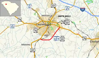 SC 127 begins at an intersection with US 221 (Greenwood Road). This is also the southern terminus of US 221 Truck south of Laurens within Laurens. The highways travel to the east and cross over Burnt Mill Creek. They curve to the northeast and have an interchange with South Harper Street Extension. After crossing the Little River, they meet US 76 (East Main Street); this intersection also marks the eastern terminus of US 76 Business. SC 127 ends here though US 76 and US 221 Truck continue to travel to the northwest of the city's downtown area.[2]