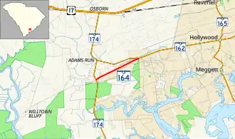 South Carolina Highway 164 (SC 164) is a 2.500-mile-long (4.023 km) state highway in the U.S. state of South Carolina. Most of the highway travels through Hollywood and acts as a shortcut between Hollywood and Edisto Beach.