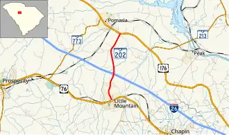 South Carolina Highway 202 (SC 202) is a 4.520-mile-long (7.274 km) state highway in the U.S. state of South Carolina. The highway connects Little Mountain and the Pomaria area. Though signed as an east-west highway, it runs in a south-to-north fashion.