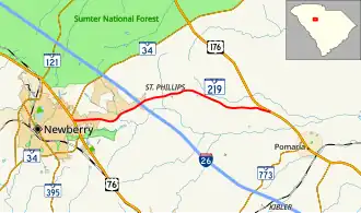 South Carolina Highway 219 (SC 219) is a 9.030-mile-long (14.532 km) highway in the U.S. state of South Carolina. The highway is designated on an east–west direction, from SC 34 in Newberry to U.S. Route 176 (US 176).