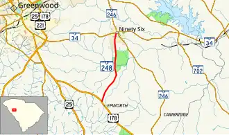 South Carolina Highway 248 (SC 248) is a 6.170-mile (9.930 km) primary state highway in the U.S. state of South Carolina. It serves as main access to the Ninety Six National Historic Site.