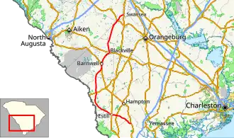 SC 3 begins at an intersection with U.S. Route 278 (US 278) in rural Jasper County. The route heads northwest, and crosses into Hampton County. Continuing northwest, it intersects US 601 before a brief concurrency with US 321 in Estill. The highway continues northwest into Allendale County. After crossing into the county, SC 3 turns north and intersects US 301 approximately seven miles (11 km) southwest of Allendale. The route continues north until it enters Barnwell County.[7]