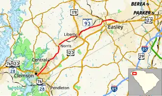 The highway begins at an interchange with the US 76/SC 28 concurrency and Old Greenville Highway east of downtown Clemson. West of this point, Old Greenville Highway passes through downtown Clemson and the campus of Clemson University and is signed as SC 93 though it is not officially part of the highway.[2][3] SC 93 heads northeast exiting the city, it then has an interchange with US 123. It then runs through Central to Norris, where it meets SC 137. From Norris, the road continues northeast into Liberty. In downtown Liberty, SC 93 intersects US 178. After leaving Liberty, the highway continues toward Easley. As it enters Easley on Liberty Drive, it promptly meets SC 8, after which it enters downtown on West Main Street. Here, it intersects with SC 135 and becomes East Main Street. After leaving downtown, SC 93 meets US 123 one last time, where its northern terminus lies.[4]