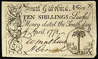 The pound was the currency of South Carolina until 1793. Initially, Pound sterling circulated, supplemented from 1703 by local paper money.[1] Although these notes were denominated in £sd, they were worth less than sterling, with 1 South Carolina shilling = 8d sterling. The first issues were known as Proclamation Money. They were replaced by the Lawful Money issue in 1748, with 1 Lawful shilling = 4+2⁄3 Proclamation shillings.